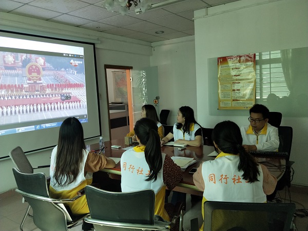 为了加强机构党员爱国主义教育,根据上级要求,东莞市同行社会工作服务中心支部委员迅速安排部署,第一时间于2019年10月25日上午,在机构总部会议室重温观看70周年阅兵主题教育活动。