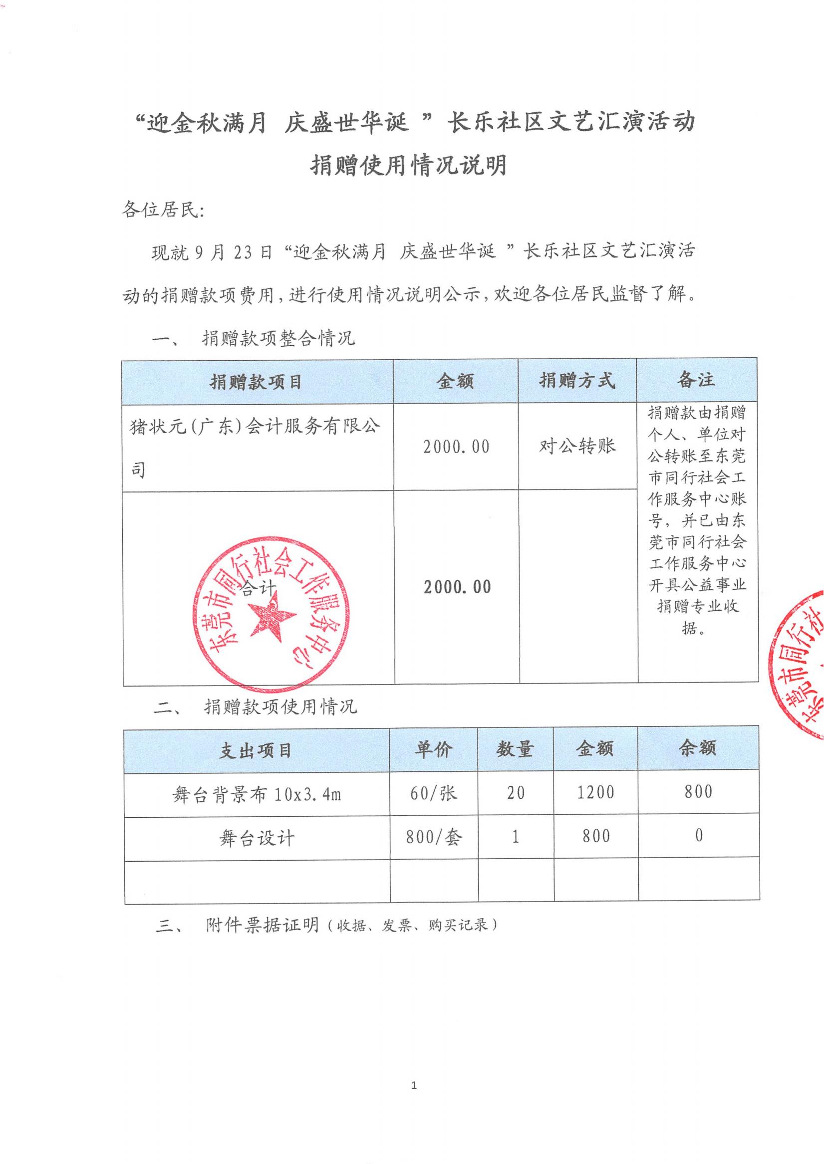 [项目]“迎金秋满月 庆盛世华诞 ”长乐社区文艺汇演活动物资捐赠使用情况说明公示