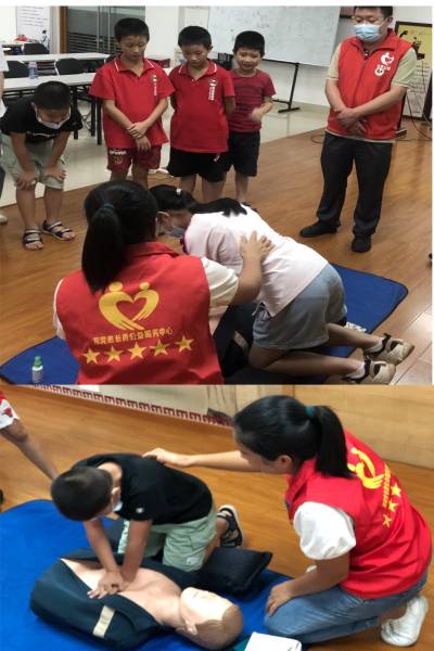 本次活动邀请东莞市长青公益服务中心应急救护宣教队老师通过播放宣传片、防溺水典型案例分享等多种形式,为家长和小朋友们上了一堂生动有趣的防溺水安全教育课。活动中老师详细讲解了如何预防溺水和遇到危险时如何进行自救等相关安全知识,并向大家讲解并进行CPR心肺复苏实操演练。最后,社工还邀请了大家上台在老师协助下实践操作。