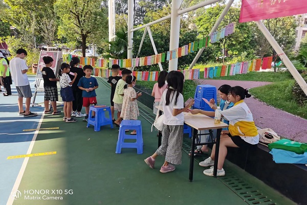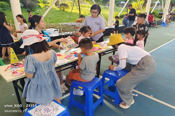 2022年9月12日星期一下午,“同心共筑,青春护航”社区青少年成长项目在锦厦农民公寓西侧篮球场举办了“情系社区,浓情中秋”游园会活动,活动现场布满了灯谜条和中秋主题的手工剪贴画,洋溢着节日的喜庆。