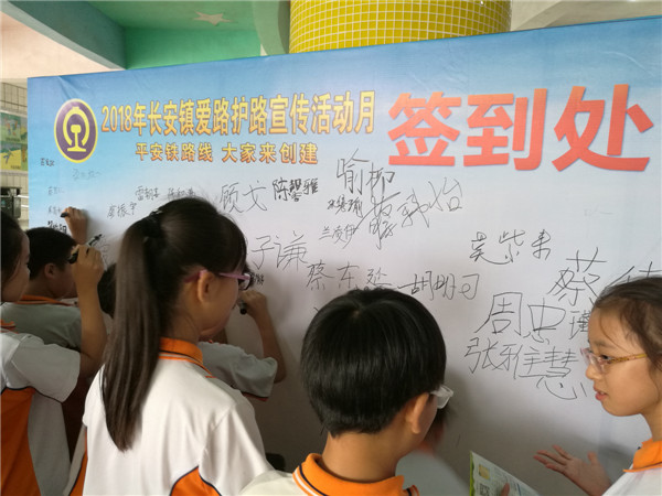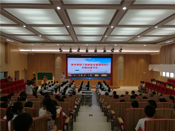 活动分为两个环节,一个组织学生到多功能室观看小安铁路安全行《铁路安全管理条例》宣传片,由深圳铁路公安处深北派出所长安警务区李彦廷警长通过课堂讲解向学生细致讲解了铁路安全常识和遵章守法的重要性,同时结合近期影响铁路安全的典型事例,讲解了向运行列车投掷杂物以及在铁道上摆放障碍物的危害性,劝导学生们不上路、不摆障、不石击,不在铁路上玩耍。另一个环节在校园活动区摆放宣传图板,设置了爱路护路主题宣传海报、签名墙等,李警长带领全级学生齐宣誓:爱路护路“不字歌”和全体学生联合签名,社工派发铁路小常识宣传单张,组织“铁路小常识”问答和“交通飞行棋”游戏,调动了广大学生参与的积极性,得到了良好反响。