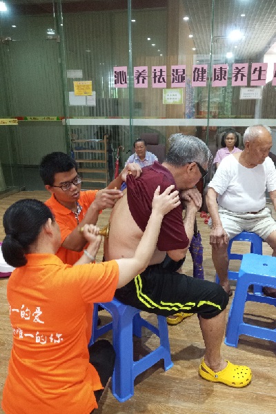 2图为:志愿者为老年人进行推背