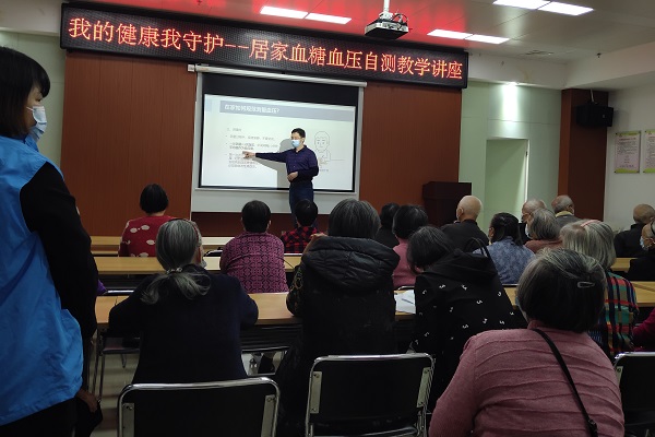 图为:社区医生为长者居民进行血压知识讲座